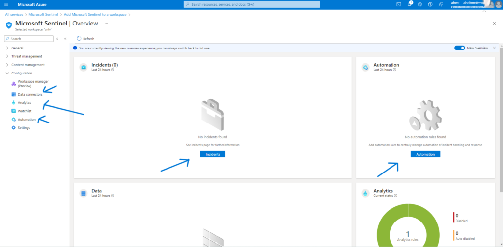 - As you can see above, it’s a free trial and my instance name is CNTV and the region where this sentinel instance is hosted is “East US” Datacenter.