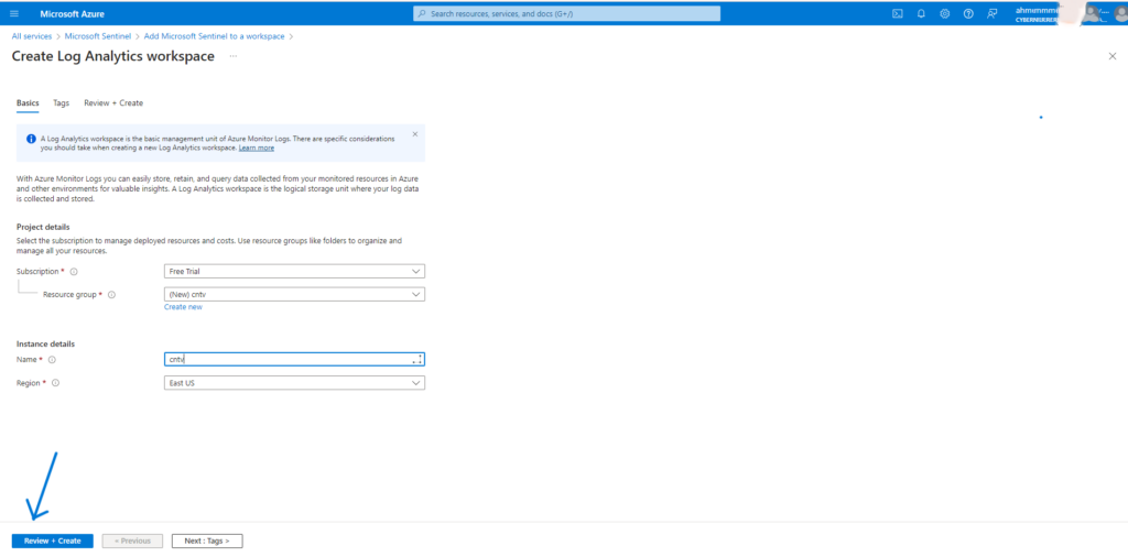 - After you create a workspace, You need to create “Log Analytics Workspace“