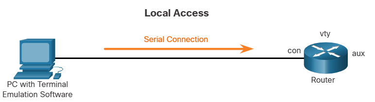 Local access to a Cisco router usually requires a serial connection to a console port on the Cisco router, and using a computer that is running terminal emulation software. An example of emulation software is Putty.