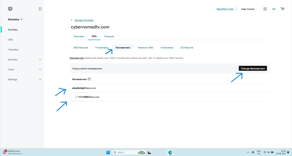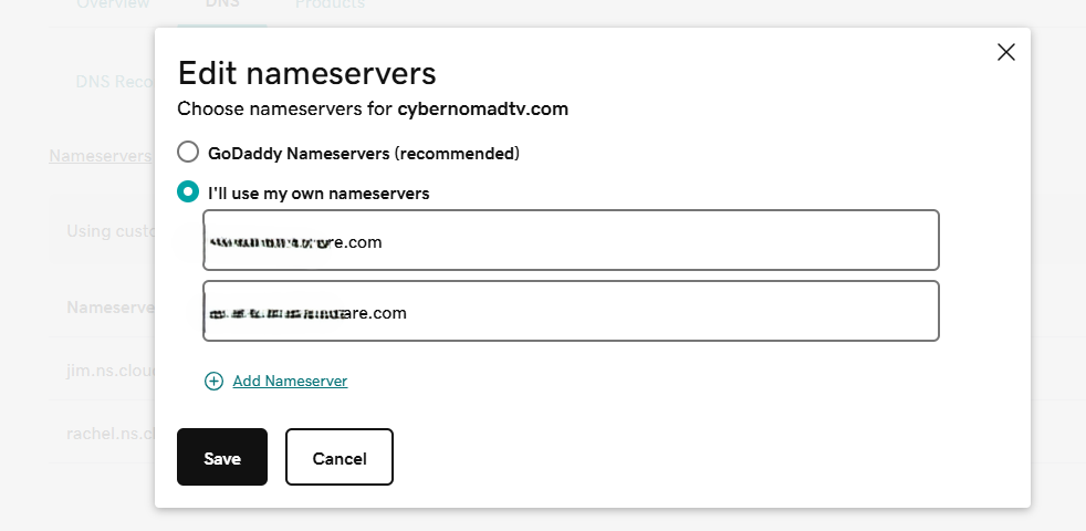 - Click on “Change Nameservers” and update it with the ones which you got.