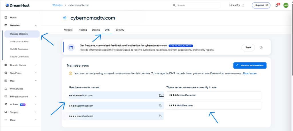 - I need to get my orignal nameservers from dreamhost to update it. Copy the nameservers from the dreamhost dashboard.