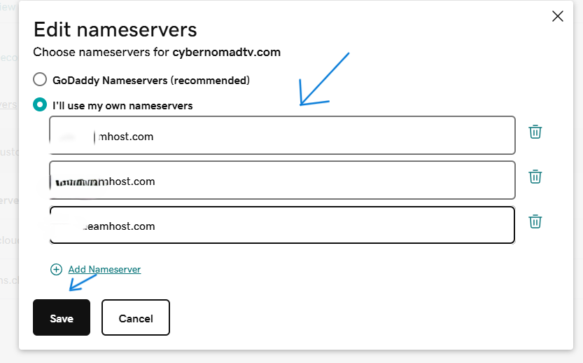 - You will see nameservers added when set up hosting or if you want to update nameservers. In my case I am using dreamhost’s nameservers because it’s my primary hosting solution